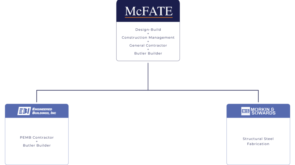 The McFate Group is a design-build and construction management contractor servicing the Midwest and Texas. We have offered turnkey construction solutions and single source responsibility in this market for over 25 years. We specialize in producing commercial and industrial structures and provide a full scope of services in all phases of construction, from design and budget development to completion. Subsidiaries of The McFate Group include certified Butler Builder® and pre-engineered metal building (PEMB) contractor Engineered Buildings, Inc. (EBI) and structural steel fabricator Morkin and Sowards.
