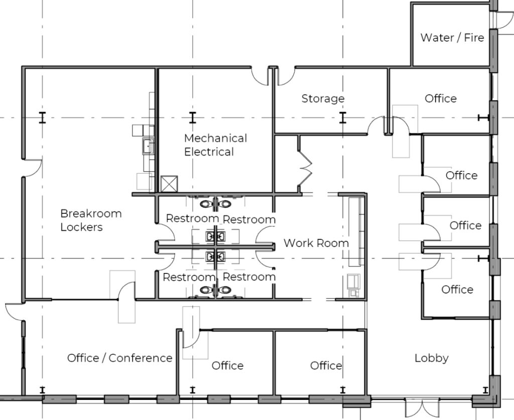 • Office area has 16’ masonry wainscot and 8’ wainscot with leveling course around rest of building perimeter